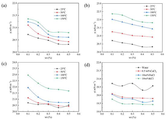 Figure 4 shows the surface tension of the PS with different concentrations in various media changing with temperature. The PS with a mass fraction of 0.10–0.50 wt% could decrease the aqueous phase’s surface tension to less than 25 mN·m−1 after aging at 25–150 °C, as shown in Figure 4a. In addition, when its concentration was constant, its surface tension increased with temperature, and its increasing extent decreased with increase in concentration. At the same temperature, the surface tension of the PS gradually decreased and tended to become stable with an increase in concentration. At a specific concentration, the changing trend of the surface tension of the PS solution with a pH of 5 was the same as that under neutral conditions, but the increasing extent of surface tension was higher. The changing trend of the surface tension of the PS solution with a pH of 10 was similar to that under neutral conditions, as shown in Figure 4c. Although its surface tension increased significantly after aging at 150 °C, its surface tension values were still lower than 25 mN·m−1, indicating that PS in alkaline solution had the poorest temperature resistance. The addition of NaCl, KCl, or CaCl2 could enhance the surface activity of the PS and decrease the surface tension of the aqueous phase, as shown in Figure 4d. In addition, the surface tension of the PS in 10 wt% KCl was the lowest. These results could be attributed to the fluorine group, hydroxyl group, and silicon–oxygen chain of the PS forming a hydration layer in the aqueous phase and absorbing metal ions around the hydration layer through electrostatic interaction, resulting in a weakening of the electrostatic repulsion of the PS, enabling the PS molecules to become more closely arranged on the surface of the solution, and finally decreasing the surface tension [18,19,20].
