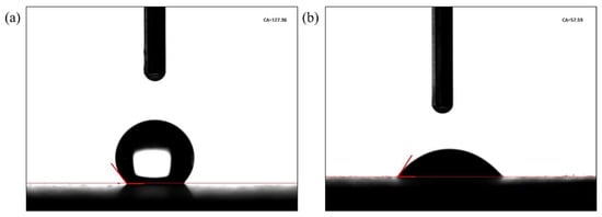 The contact angles on the surface of shale cores before and after being soaked in the PS solution are shown in Figure 5. The contact angle of the core immersed in oil was 127.96°, suggesting that the core had reached an oil-wet state [21]. After immersing the core in 0.5 wt% PS solutions for 2 d, its contact angle was 57.59°, indicating that the core had reversed to a water-wet state. This was attributed to the ability of the PS to be absorbed in the core’s surface and change the rocks’ wettability.