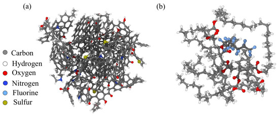 Molecular structure of (a) kerogen and (b) polymer surfactants. Colors correspond to the following atoms: C—gray; H—white; O—red; N—deep blue; F—light blue; S—earthy yellow.