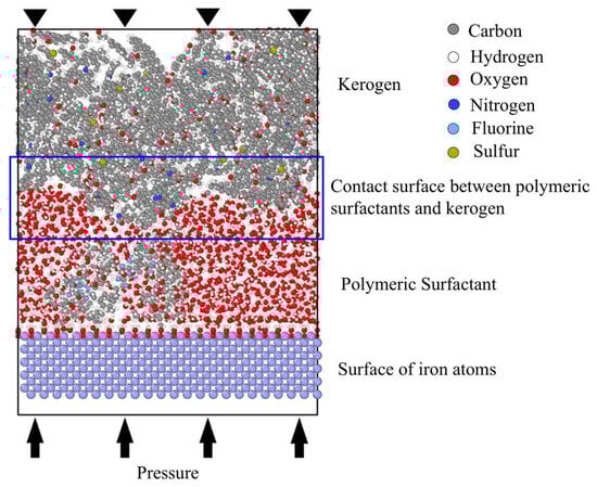 The initial structure of the simulation system is shown in Figure 8. The system was a cube with dimensions of 2.56 × 6.57 × 8.5 nm. It consisted of three main components: the molecular model of kerogen, the surfactants, and the metal surface of the drilling bit or string. The upper layer of the system contained four cheese root molecules filled with kerogen. The initial kerogen density was 1.0 g/mL, totaling 6064 atoms. Surfactants occupied the middle space of the system, between the kerogen molecules and the metal surface, containing 640 water molecules (1920 atoms) and 1 PS molecule (464 atoms). The metal surface in the lowest layer of the system was represented by iron crystals with a body-centered cubic structure, with a density of 7.9 g/mL. The model had periodic repeating features on the X and Y axes and remained intact on the Z axis (perpendicular to the metal surface direction).
