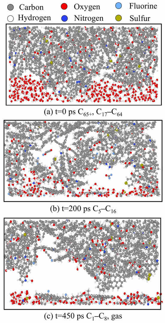 In the early stage of the simulation (0 ps), the system exhibited a tightly packed state with a straightforward interface between solid and liquid substances. At this stage, the kerogen molecules were mainly those with more than 65 carbon atoms, and some molecules between 17 carbon atoms and 64 carbon atoms (C65+ and C17–C64). In the middle stage of the simulation (200 ps), small and medium-sized molecules (C5–C16) were produced, and a small number of gas molecules were removed as the medium and large molecules were cracked, leaving a small number of voids. In the later stage of the simulation (450 ps), the kerogen molecules were broken down into small molecules (C1–C8) and released a large amount of gas that diffused towards both ends, leaving obvious voids.