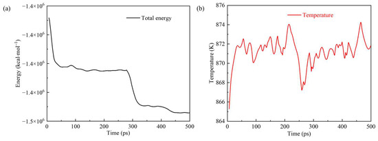 A simulated system’s thermodynamic properties can reflect the system’s total energy and other related properties. Figure 10 shows the total energy and temperature of the simulation system changing with time. The total energy continuously decreased step by step in the entire reaction process, indicating that the reaction was an exothermic process. The total energy decreased significantly within the time ranges of 0–50 ps and 250–300 ps due to the oxidation of the metal surface and the occurrence of violent reactions on the surface of kerogen molecules with molecular motion. During the two more extended periods of 50–250 ps and 300–500 ps, the total energy experienced a slow decline. In addition, the system’s temperature was always in the range of 870 ± 20 K.