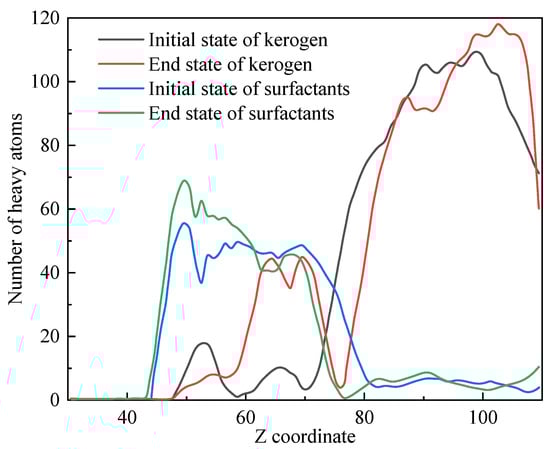 Due to the periodicity of this system in the XY direction and the layered distribution of initial substances along the Z axis, the distribution of substances along the Z-axis can reflect the density changes in substances in key areas before and after the simulation process. Figure 12 shows the distribution of heavy atoms (excluding H atoms) along the Z-axis in kerogen and surfactants.