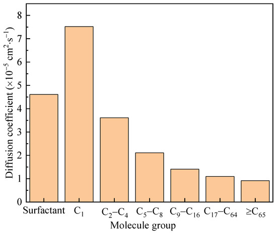 The diffusion coefficient measured the ability of particles to diffuse through random motion over time. In a simulation, the root mean square displacement can be obtained by grouping molecules and calculating the instantaneous displacement of each substance group in the motion trajectory, which is a key parameter for investigating particle dynamics behavior. After considering the mass of particles and the dimensions of the system, the diffusion coefficient of the system can be calculated based on the Einstein diffusion relationship. The diffusion coefficients of various molecules in this work are shown in Figure 13. The components of the surfactant used for the diffusion coefficient calculation included water and polymers. Various organic molecules were classified according to their carbon content. Small molecules such as C1 and C2–C4 had significantly higher diffusion coefficients than larger molecules and were prone to diffusing towards both ends. This was consistent with the conclusions presented in Figure 12.