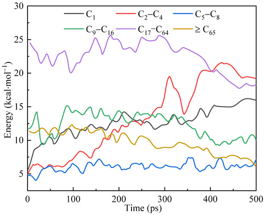 In the mid-term stage of the simulation (250–300 ps), the quantities of each substance group showed inflection points, consistent with the conclusions obtained regarding thermodynamic properties and interaction energies. The number of molecules in the medium to large mass group (C65+, C9–C16 and C17–C64) continued to decrease from this period, while the small mass group (C1 and C2–C4) significantly increased. The number of molecules (C5–C8) remained constant due to the balance between the products of larger molecule fragmentation and fragmentation into smaller molecules. In addition, the generation of C1 and shale gas was influenced by two species changes: large molecules were gradually broken down into medium and small molecules; the cracking and detachment of large molecule side chains directly yielded smaller molecules, followed by the production of C1 and shale gas. The different reaction kinetics in the simulation’s early and middle stages revealed that the reaction’s mechanism had multiple different forms.