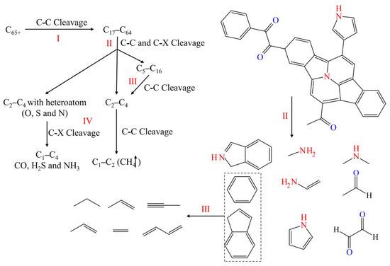 The second-level reaction (II) involved the cleavage of C-C bonds from C17–C64 to C5–C16 molecules, as well as the cleavage of C-C and C-X (X represents O, N, S) bonds on the side chains. The directly producing molecules include C2–C4 and C2–C4 with heteroatom. This type of reaction included ring-opening reactions and non-ring-opening bond cleavage. The former, such as the cleavage of polycyclic aromatic hydrocarbons into linear molecules, mainly involves the premature cleavage of side chains, especially those containing heteroatoms (O, N, and S).