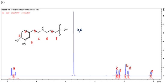 The 1H-NMR spectra of (a) DS (400 MHz, D2O): δ (ppm): 2.08 (m, 2H), 2.88–2.90 (m, 2H), 2.94–2.99 (m, 2H), 3.14–3.17 (m, 2H), 3.26 (m, 2H), 6.71–6.74 (m, 1H), 6.82–6.88 (m, 2H); and (b) ZDS (400 MHz, D2O) δ (ppm): 2.12 (m, 2H), 2.85 (t, 2H), 2.91 (m, 2H), 3.05 (s, 6H), 3.41 (m,4H), 6.67 (m, 1H), 6.76 (d, 1H), 6.80 (d, 1H).