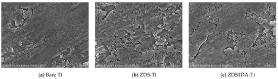 The surface morphology of the bare titanium and different modified titanium substrates is shown in Figure 2. Likely resulting from the piranha cleaning/etching effect, the bare titanium presented few pits and a coral-like structure (Figure 2a). The titanium substrates modified with the dopamine (DA)-added solution generally presented a thicker aggregate/deposited layer than those without counterparts. Further, the surface roughness/aggregates appeared to increase with the amount of DA added (Figure 2c–e,h–j). This could be attributed to the self-polymerization/aggregation of DA and the copolymerization/aggregation of DA and ZDS.