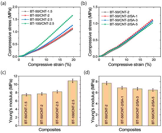 Compressive mechanical properties of rubber composites; (a,b) Stress–strain curves, and (c,d) Young’s modulus.