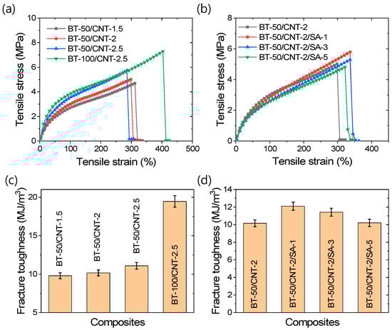 Tensile mechanical properties are important for the stretchable applications of rubber composites. It has been reported that CNT-based rubber composites exhibit excellent strain sensitivity [43,50,51]. For high-performance strain sensors, mechanical stability and stretchability are crucial parameters, along with linearity in strain sensitivity [43,50,51]. Various tensile properties of the rubber composites are presented in Figure 3a–d. From the stress–strain curves in Figure 3a, it is evident that increasing the filler content enhances the tensile strength. Unlike CNT, increasing the amount of BT leads to an improvement in the elongation at break. Figure 3b further shows that the addition of stearic acid, up to an optimal amount, results in increased tensile strength as well as elongation at break. The stress–strain curves in Figure 3b also reveal smoother profiles for stearic acid-modified composites, which can be attributed to improved filler distribution within the rubber matrix. Fracture toughness, which is directly related to the mechanical stability of rubber composites, is shown in Figure 3c,d. These figures indicate that fracture toughness improves with increasing filler content, with BT-rich composites demonstrating particularly high values. Since fracture toughness is influenced by both tensile strength and elongation at break, a significant increase in elongation can contribute to enhanced toughness. As shown in Figure 3d, stearic acid modification of the filler significantly increases the fracture toughness and overall stability of the composites. Due to the smooth stress–strain response and improved mechanical stability, the stearic acid-modified composite demonstrates excellent potential for strain sensing applications, exhibiting a fracture toughness of 12.1 MJ/m3 and an elongation at break of approximately 337%, which surpass previously reported values for similar CNT content in SBR composites [43]. The variation in tensile load with strain is provided in Figure S3a,b in the Supporting Information section.