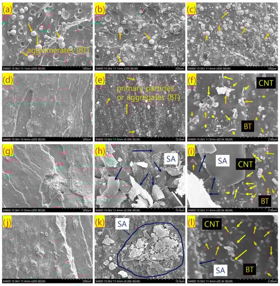 SEM images of tensile fractured rubber composites with different magnification; (a) BT-50/CNT-2 at 200×, (b) BT-50/CNT-2.5 at 200×, (c) BT-100/CNT-2.5 at 200×, (d) BT-50/CNT-2/SA-1 at 200×, (e) BT-50/CNT-2/SA-1 at 5.0k×, (f) BT-50/CNT-2/SA-1 at 25.0k×, (g) BT-50/CNT-2/SA-3 at 200×, (h) BT-50/CNT-2/SA-3 at 5.0k×, (i) BT-50/CNT-2/SA-3 at 25.0k×, (j) BT-50/CNT-2/SA-5 at 200×, (k) BT-50/CNT-2/SA-5 at 5.0k×, and (l) BT-50/CNT-2/SA-5 at 25.0k×.