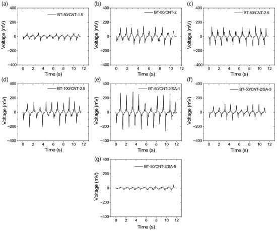 TENG output voltage profiles for different rubber composites at 2% dynamic strain and 10 loading–unloading cycles; (a) BT-50/CNT-1.5, (b) BT-50/CNT-2, (c) BT-50/CNT-2.5, (d) BT-100/CNT-2.5, (e) BT-50/CNT-2/SA-1, (f) BT-50/CNT-2/SA-3, and (g) BT-50/CNT-2/SA-5.