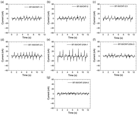 TENG output current profiles for different rubber composites at 2% dynamic strain and 10 loading–unloading cycles; (a) BT-50/CNT-1.5, (b) BT-50/CNT-2, (c) BT-50/CNT-2.5, (d) BT-100/CNT-2.5, (e) BT-50/CNT-2/SA-1, (f) BT-50/CNT-2/SA-3, and (g) BT-50/CNT-2/SA-5.