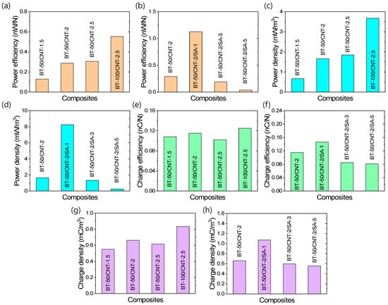 TENG efficiencies of the rubber composites under 2% compressive cyclic strain; (a,b) maximum power efficiency, (c,d) maximum power density, (e,f) charge efficiency, and (g,h) charge density.