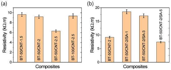 To explore potential correlations between resistivity and TENG performance, the resistivities of various composites were investigated, as shown in Figure 8a,b. These figures clearly demonstrate that the resistivity of the composites decreases with increasing CNT content, due to the formation of more conductive pathways. Conversely, increasing the amount of dielectric BT results in higher resistivity. At a fixed BT content, increasing the CNT content improves TENG performance, despite the associated reduction in resistivity. On the other hand, at a fixed CNT level, increasing the BT content enhances both TENG performance and resistivity. A similar trend is observed with improved filler dispersion—higher dispersion levels lead to enhanced TENG performance, even when the overall resistivity is higher compared to unmodified composites. These observations suggest that an optimal balance between the conductive (CNT) and dielectric (BT) components is essential for achieving high energy conversion efficiency in rubber-based TENGs. Specifically, a sufficient level of conductive network formation is necessary to support effective charge transport, while an appropriate amount of dielectric filler ensures efficient charge generation and storage.