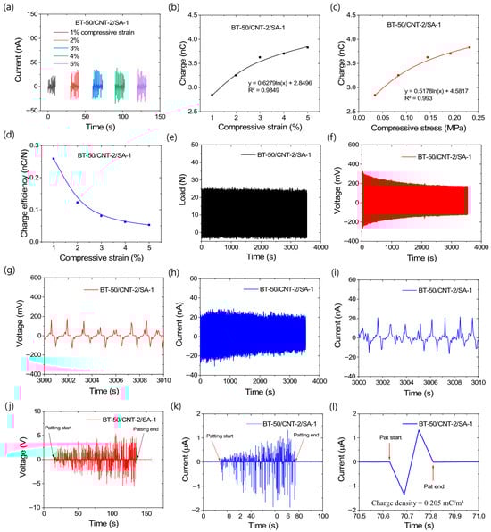 Triboelectric behavior of BT-50/CNT-2/SA-1 composite under different mechanical energy input systems; (a) current output with different cyclic compressive strains, (b) correlation of generated charge with compressive strains, (c) correlation of generated charge with compressive stress, (d) charge generation efficiencies under different compressive strain, (e) mechanical load profiles up to 3000 cycles, (f) voltage outputs up to 3000 cycles, (g) voltage outputs at higher cycles, (h) current outputs up to 3000 cycles, (i) current outputs at higher cycles, (j) voltage generation by patting, (k) current generation by patting, and (l) output current by a single pat.