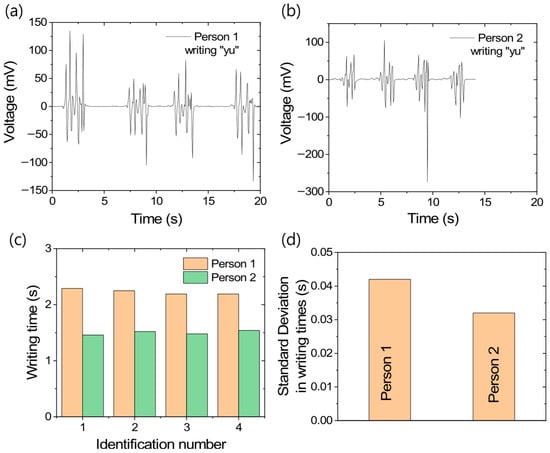 Handwriting recognition through TENG-based sensor; (a) output voltage patterns for Person 1, (b) output voltage patterns for Person 2, (c) writing times with different identification numbers, and (d) standard deviation in individual handwriting times.