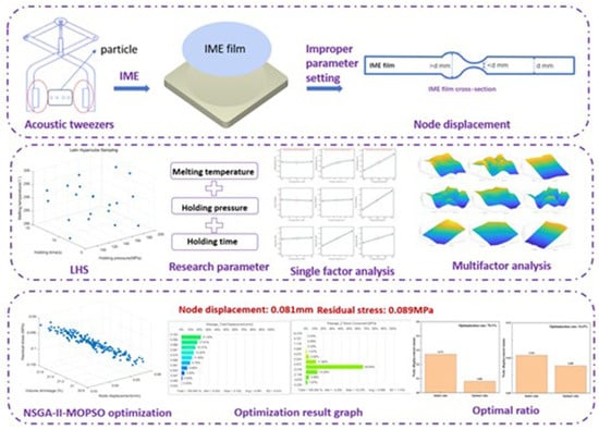 Figure 1, this study aims to ensure the nodal displacement of IME films for acoustic tweezers by optimizing the injection molding parameters. By systematically adjusting and optimizing the injection molding parameters, we can effectively control the nodal displacement of IME films. We focus on adjusting the injection molding parameters, such as temperature, pressure, and time, to optimize the nodal displacement of the IME film maximally and ensure the stability and reliability of the acoustic tweezers.
