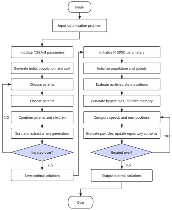 To overcome the shortcomings of these algorithms, we propose a hybrid multi-objective optimization algorithm, NSGA-II-MOPSO, which combines the advantages of NSGA-II and MOPSO, and improves the efficiency and stability of the optimization process through the fast convergence of the NSGA-II algorithm and the global searching ability of the MOPSO algorithm. In the NSGA-II-MOPSO algorithm, we use the NSGA-II algorithm to maintain the diversity of the population and utilize the MOPSO algorithm to increase the global search ability to explore the solution space better and find a better set of Pareto-optimal solutions.