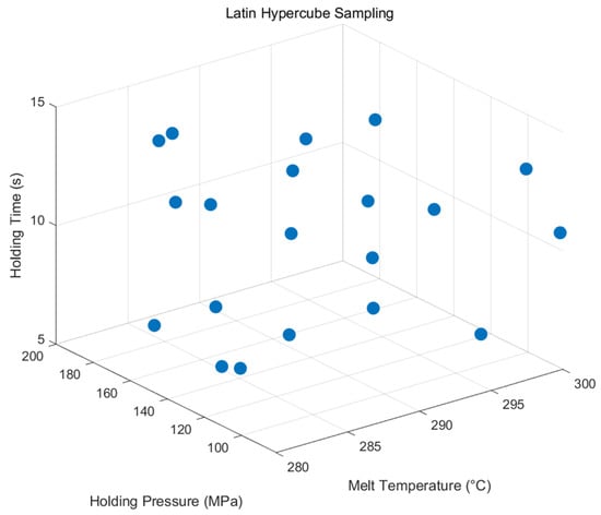 Next, we perform Latin hypercube 3D sampling to ensure that the samples are uniformly selected across intervals of holding pressure, holding time, and melt temperature. Latin hypercube sampling divides each dimension into several uniform intervals to ensure that each interval has at least one sample point, thus effectively reducing the number of sample points while still ensuring the representativeness of the samples. We control for the following ranges of these three parameters: holding pressure in the interval (80, 200), holding time in the interval (5, 15), and melt temperature in the interval (280, 300). Within these ranges, we take 20 sets of data to obtain the sample distribution graph in