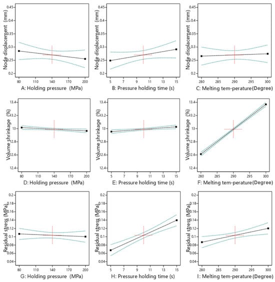 In summary, the melting temperature has a significant influence on the three factors, and a high temperature increases the values of these three parameters. The holding pressure has a great influence on nodal displacement and residual stress but a small influence on volumetric shrinkage. When optimizing injection molding parameters, the selection of melting temperature and holding time should be focused on to achieve the goal of reducing nodal displacement, volumetric shrinkage, and residual stress.