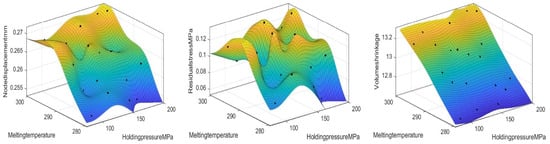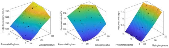 Figure 9 presents response surface plots depicting how melt temperature and holding time affect nodal displacement, residual stress, and volumetric shrinkage. Analysis shows a lowering melt temperature and holding time reduces nodal displacement and residual stress. Volumetric shrinkage declines with decreasing melt temperature, while holding time has a weaker impact on it.