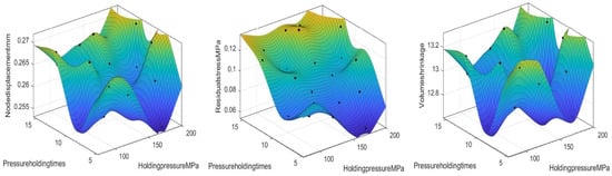 Figure 8 shows the response surface plots of the effects of holding pressure and holding time on nodal displacement, residual stress, and volumetric shrinkage. The analysis revealed that volumetric shrinkage decreases with decreasing holding pressure and holding time. However, the nodal displacement as well as the volumetric shrinkage need suitable values, so the optimal values can be further searched in the following.