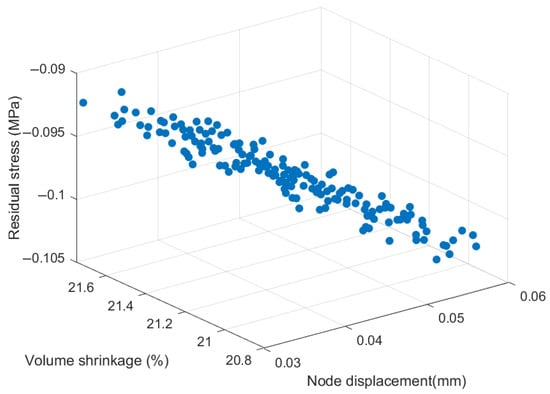 Based on 20 sets of data from LHS, three target values of node displacement, volume shrinkage, and residual stress are obtained. Next, we analyze and plot the data.