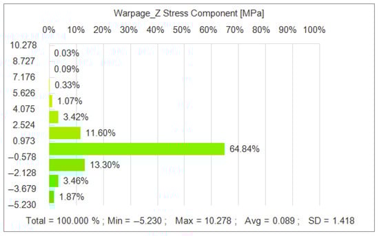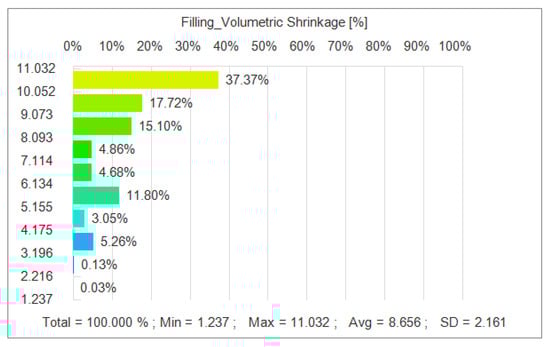 Figure 13, the optimized parameter combination effectively reduces the volume shrinkage generated during the injection molding process. The simulation results show that the residual stresses are significantly reduced under the optimal parameters, and the overall average volumetric shrinkage reaches 8.656 MPa. Through simulation, we find that the optimized injection molding process significantly reduces the warpage and volumetric shrinkage phenomena and improves the surface quality of the film.