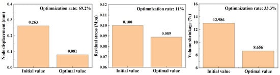 In the iterative optimization of NSGA-II-MOPSO, we obtained the optimal parameter combinations and simulated the optimized nodal displacements via simulation software. After optimization, the average nodal displacement reaches 0.081 mm compared with 0.271 mm for the initial parameter conditions. This shows that through optimization, we reduce the nodal displacement by 0.182 mm, which is an optimization of approximately 69.2%. The average residual stress after optimization reached 0.089 MPa, which is an 11% reduction in residual stress compared with 0.100 MPa in the initial parametric condition. The optimized average volumetric shrinkage reached 8.656%, whereas it reached 12.986% in the initial parametric condition; the volumetric shrinkage was reduced by 33.3%. The optimized histograms of the average nodal displacement, residual stress, and volumetric shrinkage are shown in