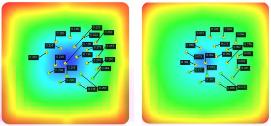 Figure 15 shows a schematic diagram of the node displacement before and after optimization. To compare the node displacement before and after optimization, we used the identifiable performance evaluation method to analyze the node displacement.