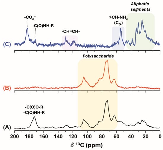 13C CP-MAS spectra (MAS rate: 15 kHz) for washed DDGS (A), polysaccharide DDGS (B), and DDGS-NP (C) samples.