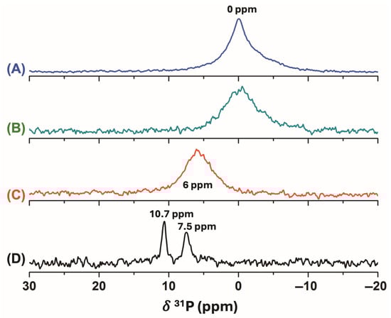 Furthermore, 31P solid-state NMR experiments were performed in order to elucidate the chemical structures that contributed to the phosphorus content (Figure 2). In all samples, 31P direct-polarization experiments were used because of the higher signal-to-noise ratio in comparison with the CP-MAS experiments. For the pristine and washed DDGS materials, a broad 31P NMR signal was present at a δ31P~0 ppm, which was related to a mixture of inorganic phosphate and phosphomono- and/or phosphodiester molecules commonly present in DDGS [45,46,47,48]. The alkaline treatment also affected the 31P NMR signal of the pristine DDGS material due to the hydrolysis of the phosphoesters, with the orthophosphate anion (PO43-) being the main component, whose signal was detected at δ31P = 6.0 ppm in the isolated polysaccharide content. Interestingly, different crystalline states were identified at a δ31P = 7.5 and δ31P = 10.7 ppm for the orthophosphate species in the DDGS-NPs depending on the number of water molecules surrounding the anion. These results are in agreement with previous studies performed with sodium orthophosphate in its pure form and present in foods [49,50]. Even when the unequivocal assignment of the 31P solid-state NMR signal could be performed, the 31P solution-state NMR spectrum of the DDGS-NPs dispersed in D2O revealed the typical orthophosphate signal at a δ31P = 5.39 ppm, with the concomitant disappearance of signals at higher frequency values.