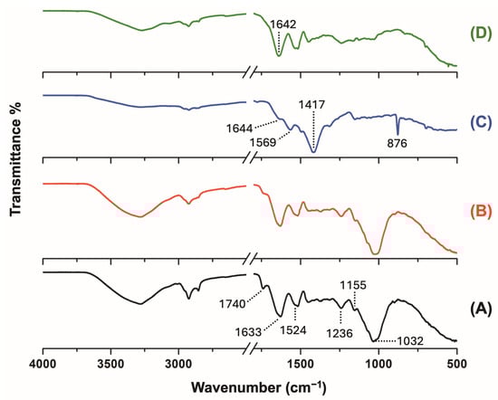 ATR-FTIR spectra for the pristine DDGS (A), washed-DDGS (B), DDGS-NPs (C), and DDGS-NPs treated with HCl solution (D).