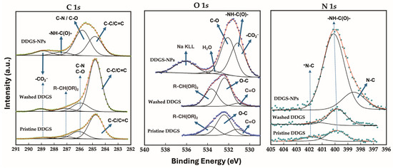 Finally, XPS studies were undertaken in the different DDGS and DDGS-NP samples, and the results are shown in Figure 4 and Figures S2 and S3. In addition to the surface composition of DDGS samples, the high-resolution XPS spectra provided information related to the oxidation state and organic or inorganic origin of each element through the binding energy (BE) values (Tables S1–S3).