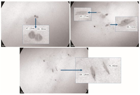 Furthermore, TEM analysis was used to investigate the morphology and size of DDGS-NPs from DDGS. The images reveal two predominant nanoparticle morphologies, spherical and rod-like structures, with average dry-state sizes smaller than those measured by DLS. This discrepancy could be attributed not only to the hydration shell surrounding the protein nanoparticles in aqueous media, which increases their apparent hydrodynamic diameter in DLS measurements, but also to the effects caused by the sample preparation process for TEM [68,72,73]. The drying process and the interaction of the nanoparticles with the carbon-coated grid can induce partial structural contraction or deformation, acting as artifacts that reduce the measured size. These phenomena are well recognized in nanoparticle characterization and highlight the importance of combining complementary techniques to obtain a more accurate understanding of particle dimensions. Although both morphologies were clearly distinguishable by TEM, a tendency to aggregate was predominantly observed with rod-like particles (Figure 5), which may be attributed to their larger surface areas and anisotropic interparticle interactions during drying. Moreover, the spherical particles had an average diameter of approximately 47 nm, while the rod-shaped nanoparticles exhibited lengths ranging from 66 to 85 nm (Figure 5). Overall, the TEM findings corroborate the nanometric scale of the structures observed by DLS while providing additional insight into their heterogeneous morphology.