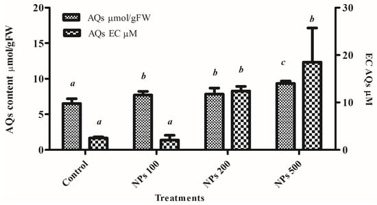 Figure 6 shows the effects of different DDGS-NP concentrations (100, 200, and 500 mg L−1) on AQ accumulation in the hairy root cultures of R. tinctorum (Figure S4). All the concentrations tested caused an increase in specific AQ production. The addition of 100, 200, and 500 mg L−1 NPs increased the AQ content to 7.7, 7.8, and 9.3 µmol/gFW (18, 23, and 43% increases, respectively, compared to control cultures). The effects of DDGS-NP elicitation on extracellular AQ accumulation are shown in Figure 6. It can be observed that 200 and 500 mg L−1 induced AQ release to the culture medium, reaching levels of 12 and 18 µM, respectively. On the other hand, control cultures and cultures treated with 100 mg L−1 DDGS-NPs induced an accumulation of AQs of approximately 2 µM.