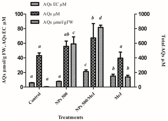 Cultures treated with DDGS-NPs and DDGS-NPs/MeJ showed significant increments in AQ volumetric production, reaching levels of 620.2 and 783 µM, respectively, compared with control cultures (430 µM, Figure 7). No significant differences were found between control and MeJ-treated roots, probably due to a slight decrease in hairy root growth after MeJ elicitation.