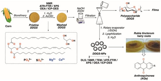 Initially, 8 g of crude DDGS was dispersed with 50 mL of deionized water and stirred for 40 min. The mixture was washed three times with deionized water by centrifugation at 4000× g for 5 min and then dried overnight at 65 °C. The resulting material was further treated three times with 50 mL of AcOEt, followed by centrifugation at 4000× g for 5 min, and dried overnight at 65 °C, yielding 6 g of washed DDGS. Next, 1 g of washed DDGS was mixed with 12 mL of EtOH and 18 mL of 0.8 M NaOH and incubated at 65 °C for 30 min. The dispersion was then filtered, and the solid polysaccharide DDGS fraction was isolated, and the desired hydroalcoholic solution was collected. After that, ethanol was removed under vacuum with a rotary evaporator, and the aqueous solution was frozen and lyophilized to obtain the DDGS-NPs (~2 g). A chemical analysis was performed between batches to ensure the chemical composition. It is important to check the chemical composition using OEA, ICP-OES, XPS, solid-state NMR, and ATR-FTIR techniques. Finally, 10 mg of the dry-freezed sample was dispersed in 1 mL of deionized water to render the nanoformulation named DDGS-NPs.