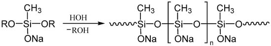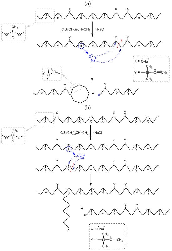 As described above, the resulting polysodiumoxy(methyl)siloxane may contain both sodiumoxy and hydroxy groups in its composition, depending on the conditions of HPC. Partial preservation of sodiumoxy groups in the blocked variant of polysodiumoxy(methyl)siloxane can lead to cleavage of the siloxane bond of the blocked product [53,54,55,56] (Figure 3). Such a gap can lead to both intramolecular interactions (Figure 3a) and intermolecular interactions (Figure 3b).