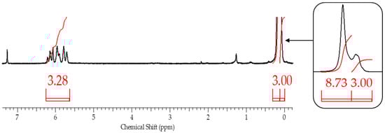 In a three-neck round bottom flask equipped with a magnetic stirrer, a reflux condenser, a thermometer, and a dropping funnel, 5 g (0.0510 mol) of polysodiumoxy(methyl)siloxane in 18 mL of hexane at −70 °C was loaded under argon cushion, and 7.67 mL (0.0561 mol) of vinyldimethylchlorosilane was added under vigorous stirring. The mixture was stirred at room temperature (25 °C) for 2–3 h. Following the formation of an acidic medium, the mixture was washed with water, and 0.41 mL (0.0051 mol) of pyridine was added; then, the residual water was removed over anhydrous sodium sulfate for 24 h. The precipitate was filtered off. The solvent was removed by an oil pump (1 Torr). The obtained product was a transparent, colorless, viscous liquid. The yield of the product was 75%. 1H NMR (CDCl3): δH: 5.69–6.21 ppm (3H; SiCH=CH2); 0.12–0.19 ppm (6H; SiCH3); 0.02–0.12 ppm (3H; SiCH3).