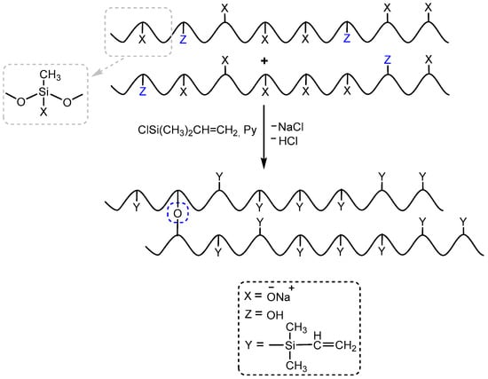In a three-neck round bottom flask equipped with a magnetic stirrer, a reflux condenser, a thermometer, and a dropping funnel, 5 g (0.0510 mol) of polysodiumoxy(methyl)siloxane, 18 mL of hexane, and 4.51 mL (0.0561 mol) of pyridine were loaded under an argon cushion. Upon cooling to −70 °C and vigorous stirring, 7.67 mL (0.0561 mol) of vinyldimethylchlorosilane was added. The mixture was stirred at room temperature (25 °C) for 2–3 h. The mixture was then washed with water in hexane to neutral medium, and then the residual water was removed over anhydrous sodium sulfate for 24 h. The precipitate was filtered off. The solvent was distilled off under vacuum (1 Torr). The obtained product was a transparent, colorless, viscous liquid. The yield of the product was 81%. 1H NMR (CDCl3): δH: 5.69–6.21 ppm (3H; SiCH=CH2); 0.12–0.19 ppm (6H; SiCH3); 0.02–0.12 ppm (3H; SiCH3).
