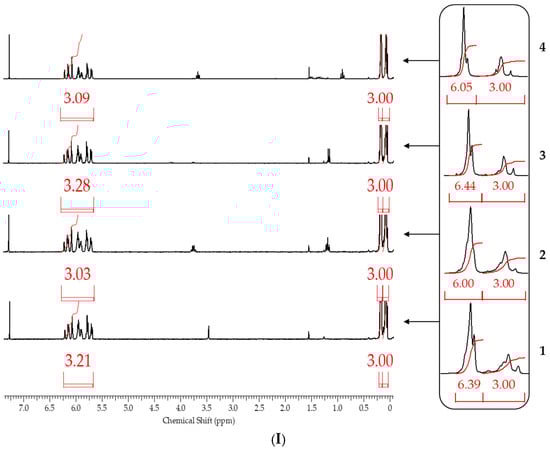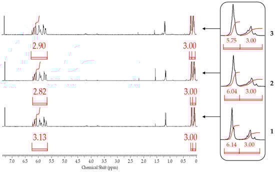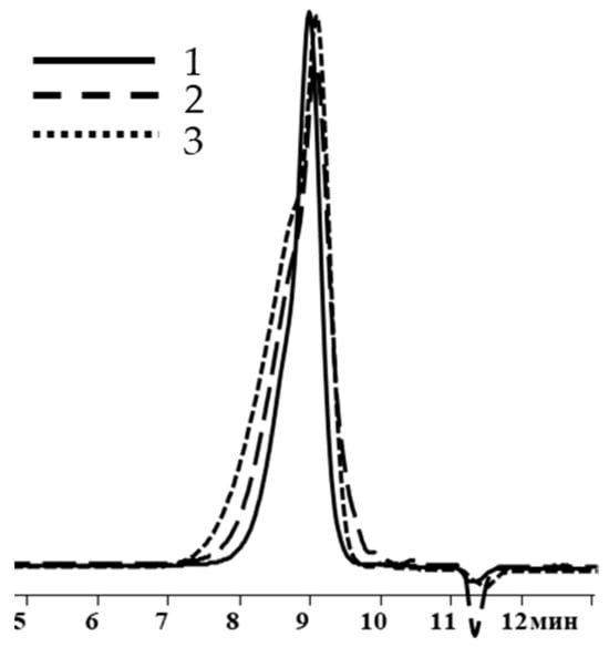 It follows from the table that only when the blocking conditions of blocking conditions 1 (chlorosilane is added to the mixture of polysodiumoxy(methyl)siloxane, pyridine, and hexane) are met, there are no distortions in the structure of the formed reaction products, according to the 1H NMR spectroscopy data. At the other two variants of blocking, the underestimation of signals of protons of vinyl and methyl groups in the side substituent is observed, which may indicate the occurrence of side processes in the form of cleavage of the siloxane bond or condensation. The increase in molecular weight and polydispersity of the formed polymers can be used as a confirmation of the occurrence of side processes under blocking conditions 2 and 3 (Table 2, Figure 10).
