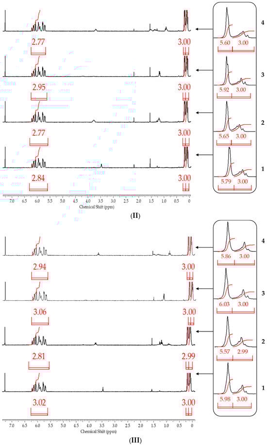 1H NMR spectra of polysodiumoxy(methyl)siloxanes obtained in (1) methanol, (2) ethanol, (3) propan-2-ol, (4) n-butanol, and blocked under blocking conditions: (I)—1, (II)—2, and (III)—3.