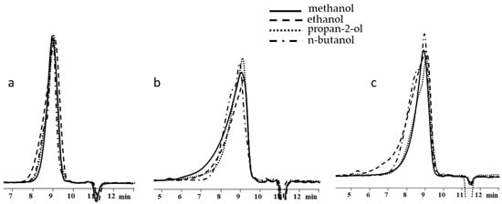 GPC curves of polysodiumoxy(methyl)siloxanes blocked under blocking conditions 1: (a) 1, (b) 2, and (c) 3. Toluene, 104 Å.