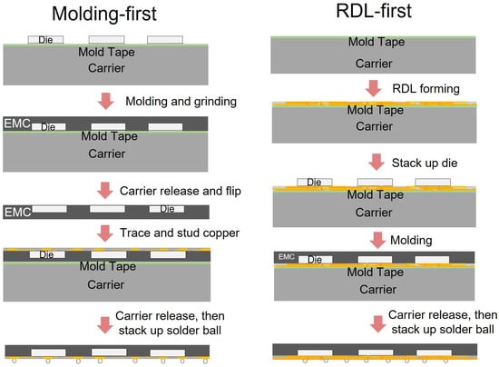 - Chen, S.; Wang, S.; Hunt, J.; Chen, W.; Liang, L.; Kao, G.; Peng, A. A Comparative Study of a Fan-Out Packaged Product: Chip First and Chip Last. In Proceedings of the IEEE 66th Electronic Components and Technology Conference, Las Vegas, NV, USA, 31 May–3 June 2016; pp. 1483–1488. [Google Scholar]