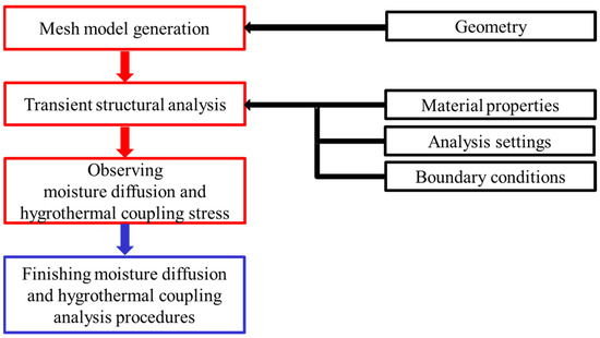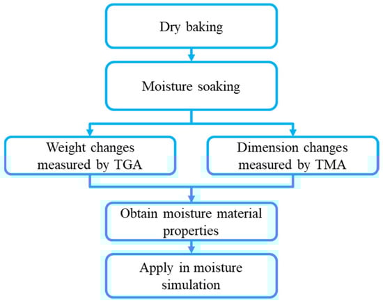Recent studies have also addressed various aspects of FOPLP reliability. Jiang [13] focused on the reliability of power devices under pressure cooker testing, emphasizing delamination behavior due to moisture uptake. Liang [14] conducted comprehensive analyses of warpage and residual stress in panel-level packages, considering the effects of process steps such as molding and debonding. However, these studies do not directly measure the coefficient of moisture expansion nor simulate the coupled interaction between moisture diffusion and thermal–mechanical behavior during reflow.