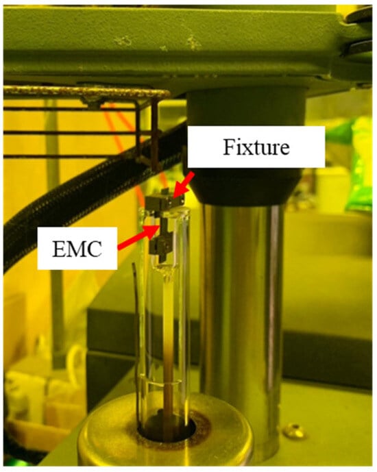 The moisture absorption and TGA experiments were primarily conducted by Innolux Corporation, Tainan, Taiwan. Therefore, this study focuses on the TMA procedures and results. The TMA equipment (Q400, TA Instruments, New Castle, DE, USA) and experimental process are shown in Figure 3 and Figure 4. As illustrated in Figure 5, samples with dimensions of 5 × 20 × 0.5 mm3 were clamped onto the TMA stage. The samples were heated at a rate of 10 °C/min to the target temperature and kept for 300 min to observe the dimensional changes associated with moisture desorption.