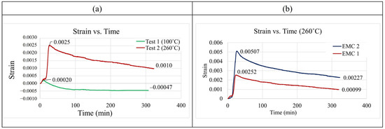 Figure 7a shows the strain variation under different testing conditions. An initial increase in strain is observed as the temperature rises, primarily due to thermal expansion of the EMC and surrounding materials. Once the structure reaches the elevated temperature, the strain gradually decreases as the internal moisture content in the EMC is reduced through temperature-driven diffusion and desorption. Figure 7b illustrates the strain variation for two types of EMC material (EMC 1 and EMC 2). Compared to EMC 1, EMC 2 exhibits more significant strain variation, indicating a stronger response to the combined effects of temperature and moisture.