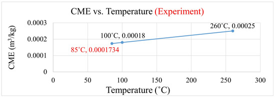 Coefficient of moisture expansions for EMC 1 material at the two testing conditions (100 °C and 260 °C) were calculated to be 1.8 × 10−4 and 2.5 × 10−4 (m3/kg), respectively. Since the moisture sensitivity levels (MSLs) were calculated at 85 °C, the coefficient of moisture expansion was obtained through extrapolation and was found to be 1.7 × 10−4 (m3/kg), as shown in Figure 9.